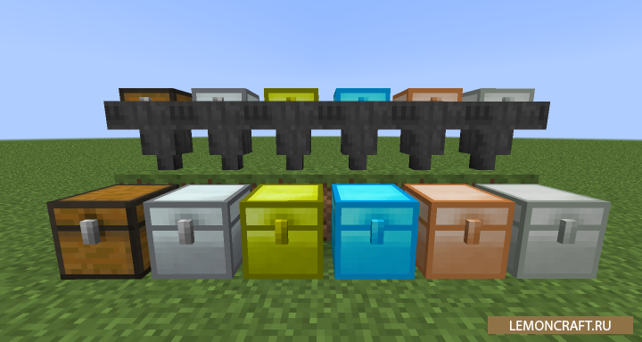 Мод на воронки с сундуками Chest Hoppers позволит автоматизировать некоторые процессы путем добавления в игру воронки с сундуками. В данных воронках будет больше места и стандартный функционал, но просто бросить туда предмет не получится. Для того, что бы положить предмет в воронку, вам нужно будет ее открыть, так же как и сундук. Данный мод совместим с модом Iron Chests.